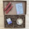 Brievenbuspakketje met 2 kaarsen, bloemenzaden, gastenzeepje, amberblokje en een schaaltje.