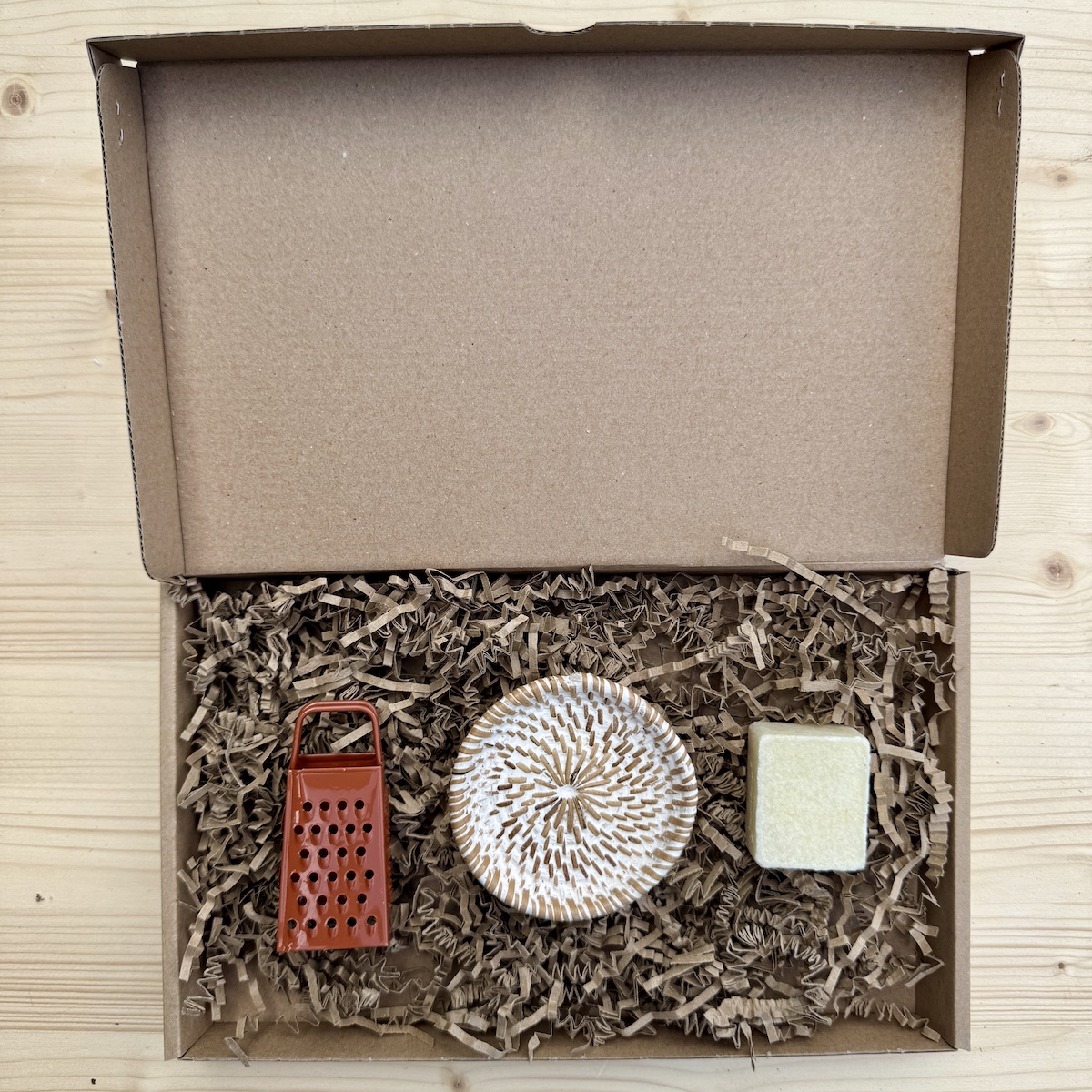 Brievenbuspakketje met een amberblokje, mini rasp en het rieten schaaltje. Stel zelf de variaties samen!