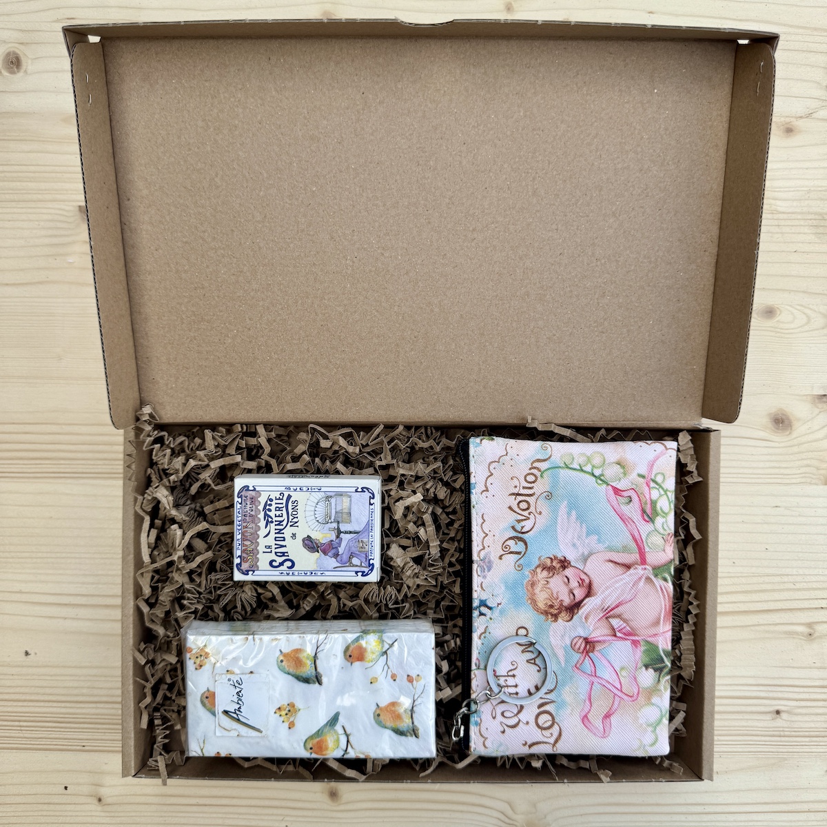 Brievenbuspakketje voor onderweg met een portefeuille, zakdoekje en gastenzeepje.